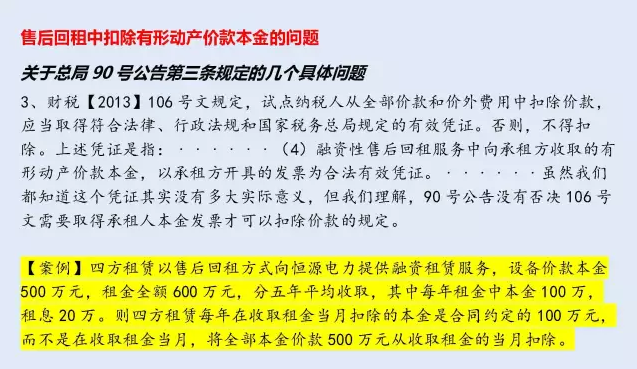 90號公告第三條規(guī)定,納稅人提供有形動產(chǎn)融資性售后回租服務(wù),計算當(dāng)期銷售額時可以扣除的有形動產(chǎn)價款本金,為書面合同約定的當(dāng)期應(yīng)當(dāng)收取的本金。無書面合同或者書面合同沒有約定的,為當(dāng)期實際收取的本金。