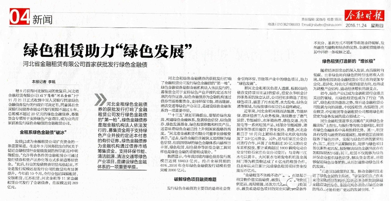 繼9月獲得河北銀監(jiān)局的批復(fù)后,河北省金融租賃有限公司(以下簡(jiǎn)稱“河北金租”)于11月21日正式收到中國(guó)人民銀行同意綠色金融債券發(fā)行的行政許可決定書(shū),同意其在全國(guó)銀行間債券市場(chǎng)公開(kāi)發(fā)行期限不超過(guò)5年、總規(guī)模不超過(guò)20億元的綠色金融債券,募集資金專項(xiàng)用于支持綠色產(chǎn)業(yè)項(xiàng)目,成為業(yè)內(nèi)首家獲準(zhǔn)發(fā)行綠色金融債的金融租賃公司。