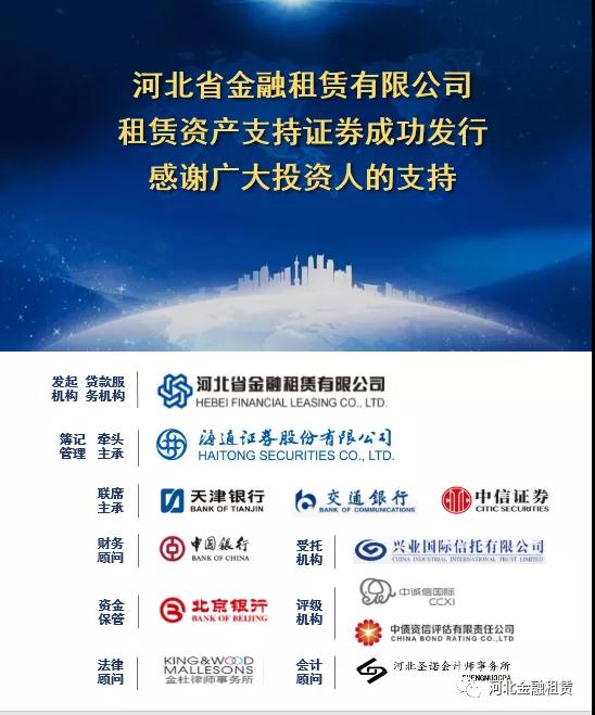 日前,河北省金融租賃有限公司(以下簡(jiǎn)稱(chēng)“河北金租”)冀租穩(wěn)健2020年第一期租賃資產(chǎn)支持證券在銀行間債券市場(chǎng)成功簿記建檔發(fā)行,獲得了交通銀行、中國(guó)銀行等大型國(guó)有銀行及其他各類(lèi)銀行的踴躍認(rèn)購(gòu),合計(jì)金額15.65億元。