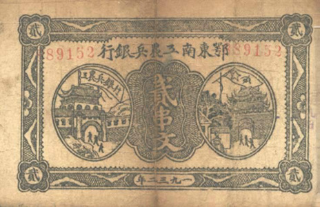 鄂豫皖革命根據(jù)地是在1927-1929年期間鄂東北的黃麻起義、豫東南的商南起義、皖西的六霍起義等基礎(chǔ)上,創(chuàng)立的在鄂豫皖三省邊界以大別山為中心的革命根據(jù)地。1930年10月,鄂豫皖特區(qū)蘇維埃銀行在七里坪成立,其職能主要是通過借貸、儲蓄、兌換等業(yè)務(wù)工作,籌集資金,幫助根據(jù)地的人民發(fā)展工、農(nóng)、商業(yè)。對于農(nóng)民用于購置耕牛、農(nóng)具、種子的貸款,一律免息,其余貸款酌量收息。銀行還發(fā)行過多種面值的紙幣、布幣、銅幣、銀元和“經(jīng)濟(jì)公社流通券”(購油、布等物的憑證)。