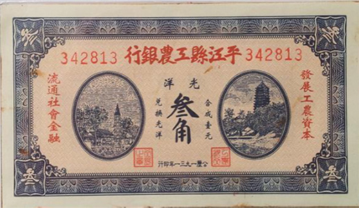 中央蘇區(qū)的紅色政權(quán)成立之后,國民黨在進(jìn)行反革命軍事“圍剿”的同時,還采取了嚴(yán)密的經(jīng)濟(jì)封鎖切斷了當(dāng)時閩西蘇區(qū)與外界的聯(lián)系,給當(dāng)時閩西經(jīng)濟(jì)制造了嚴(yán)重的困難。為了打破國民黨的經(jīng)濟(jì)封鎖,閩西蘇區(qū)政府通過公營商業(yè)、合作社商業(yè)、私營商業(yè)推動商品流通來發(fā)展經(jīng)濟(jì)。當(dāng)時在閩西蘇區(qū),不僅有國民政府的中央銀行、中國銀行、交通銀行、農(nóng)民銀行四行紙幣,還有軍閥張貞發(fā)行的“民興”鈔、資本家徐名鴻發(fā)行的“閩西農(nóng)民”鈔,同時還有大量雜洋等劣質(zhì)銀幣充斥市場,且銀價極不統(tǒng)一,金融市場非?;靵y。為了蘇區(qū)人民經(jīng)濟(jì)生活的穩(wěn)定和工農(nóng)業(yè)生產(chǎn)的發(fā)展,1927年12月,福建上杭縣蛟洋農(nóng)民協(xié)會建立了福建省第一個紅色金融機(jī)構(gòu)——蛟洋農(nóng)民銀行,行址設(shè)于蛟洋村的“義合祠”。創(chuàng)辦時資本金僅有2000元大洋,工作人員3人。農(nóng)民銀行成立后,隨即發(fā)行流通券4000元,面值有1元和3角兩種,主要在上杭蛟洋,龍巖的大池、小池,以及連城的廟前、莒溪一帶流通。蛟洋農(nóng)民銀行規(guī)定,流通券以銀元為本位幣,可以隨時兌換,可以在農(nóng)民銀行興辦的商店內(nèi)購買各種生活必需品;家庭貧困者,可以在農(nóng)民銀行借款,借款5元以下不計利息。