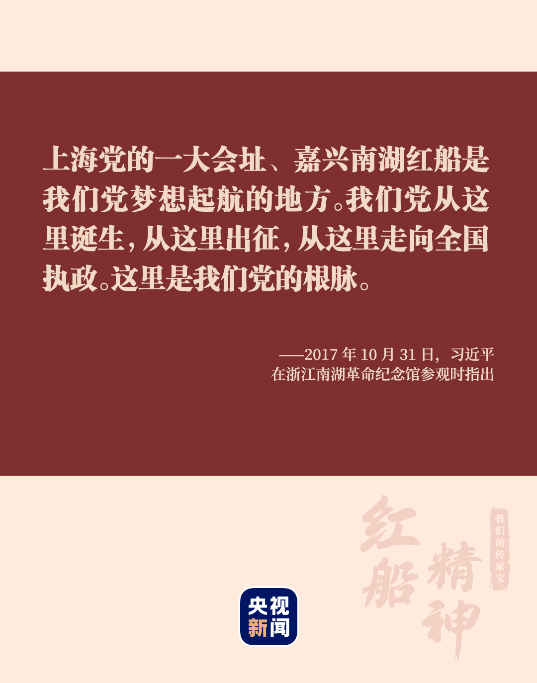 在浙江工作時(shí),習(xí)近平為南湖革命紀(jì)念館奠基。2005年6月,他在文章《弘揚(yáng)“紅船精神” 走在時(shí)代前列》中對“紅船精神”作出概括:“開天辟地、敢為人先的首創(chuàng)精神,堅(jiān)定理想、百折不撓的奮斗精神,立黨為公、忠誠為民的奉獻(xiàn)精神。”