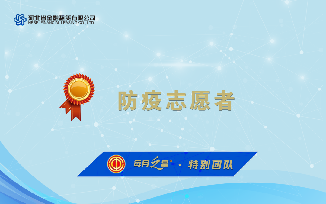 江瀚、杜倩、高全友、熊偉光、謝斌、田靖卿、康田、尚晨光、陳長(zhǎng)亮 岳思雨、宋志龍等志愿者組成防疫期間的公司特別團(tuán)隊(duì),他們無(wú)聲鏗鏘、匯聚微光,為石家莊抗擊疫情貢獻(xiàn)出滿滿的正能量,守護(hù)了城市安全和群眾健康,彰顯河北金租人的責(zé)任和擔(dān)當(dāng)。